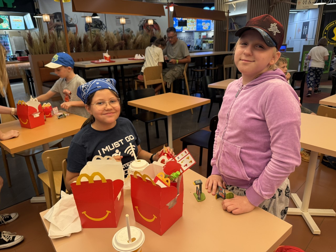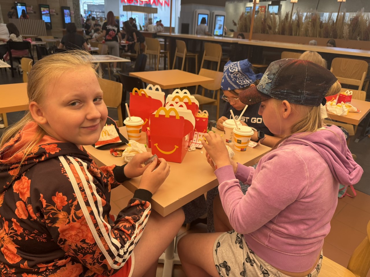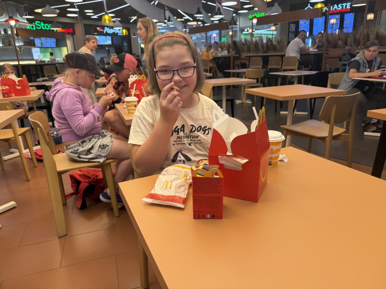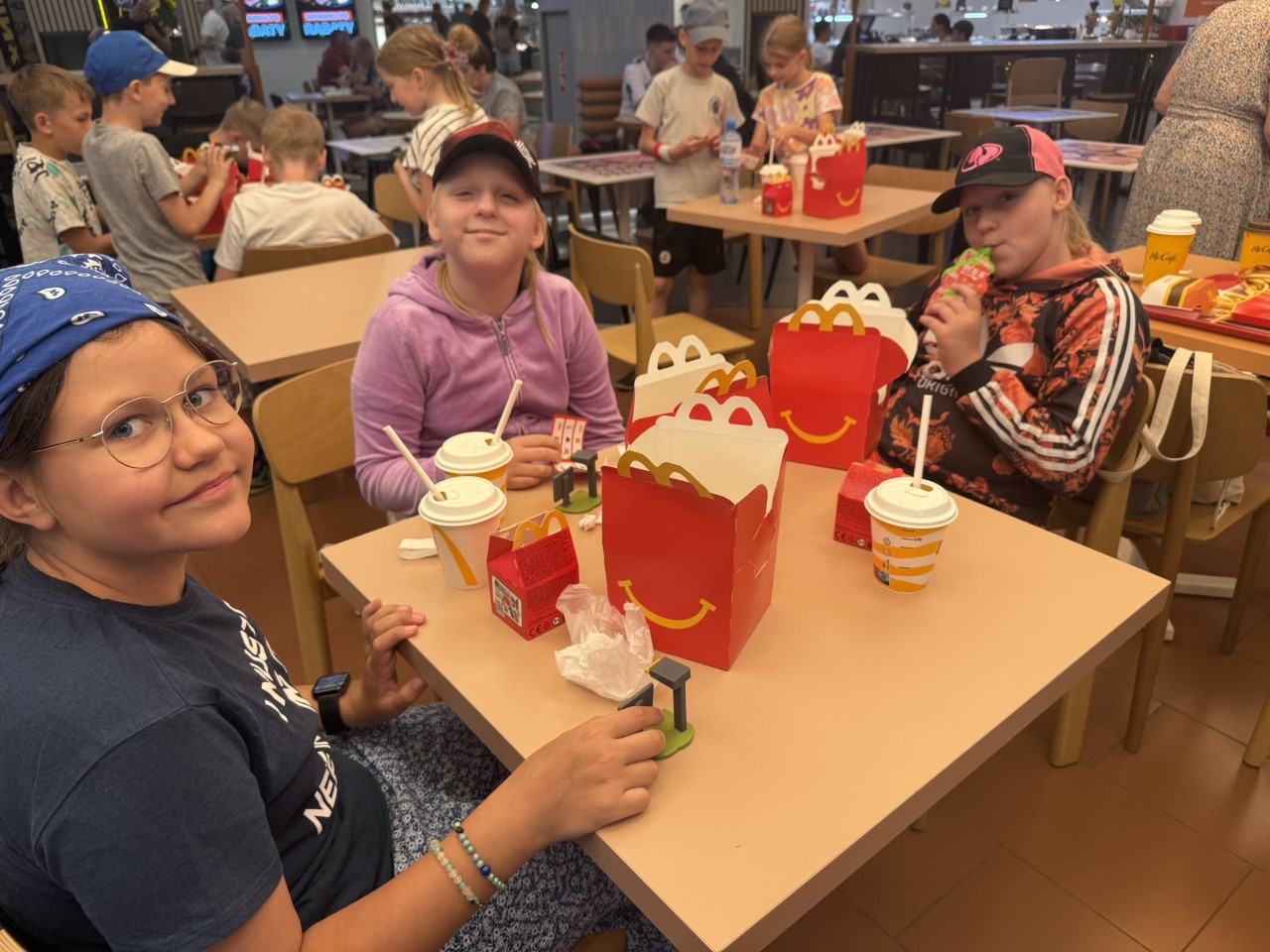 Po filmie, z okazji zakończenia wspólnego tygodnia, udaliśmy się do McDonald’s. Była to nagroda za wzorowe zachowanie, aktywny udział w zajęciach i ogromne zaangażowanie dzieci przez wszystkie dni. Uśmiechy na twarzach uczestników były najlepszym dowodem na to, że ten tydzień był pełen wrażeń, radości i dobrej zabawy. Teraz już czekamy na kolejny tydzień oraz na rysunki dzieci z minionego tygodnia 🙂