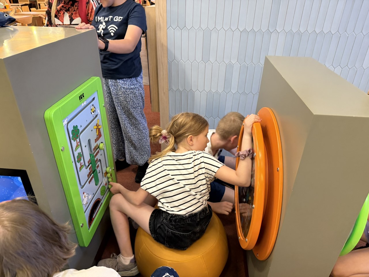 Po basenie udaliśmy się na zajęcia z programowania z wykorzystaniem klocków LEGO. Każda grupa otrzymała zestaw konstrukcyjny oraz tablet. Na początku zbudowaliśmy Koło Młyńskie, a następnie przeszliśmy do programowania jego działania. Zadanie polegało na tym by tak zaprogramować konstrukcję, aby umożliwić wejście ludzików na koło, a także wprowadzić dodatkowe efekty – dźwięki, zmieniające się kolory oraz różne prędkości obrotu.