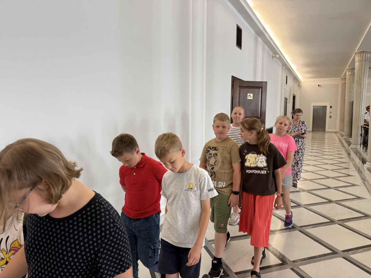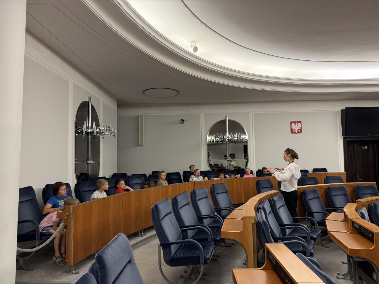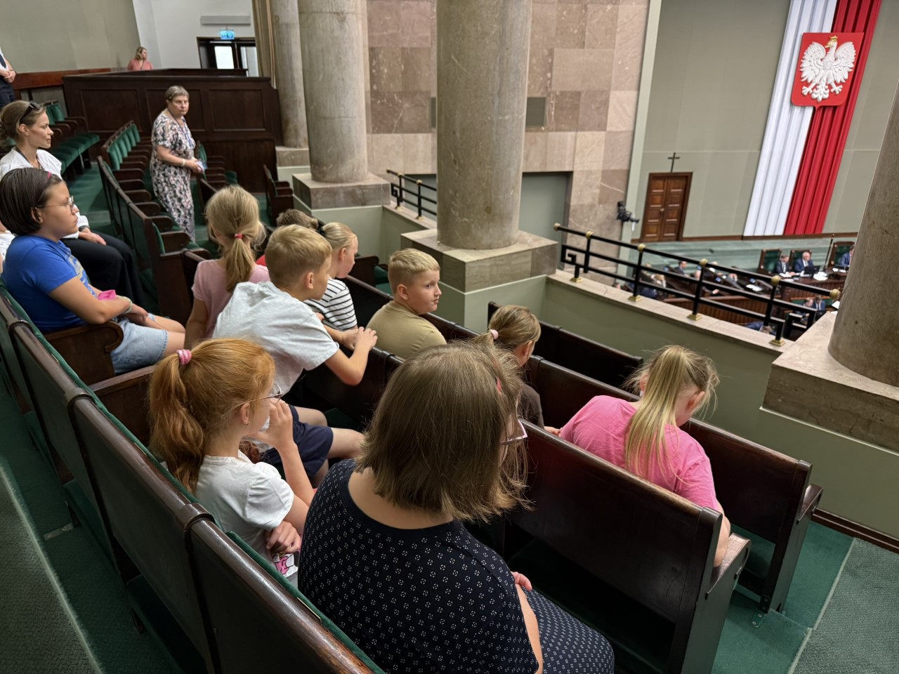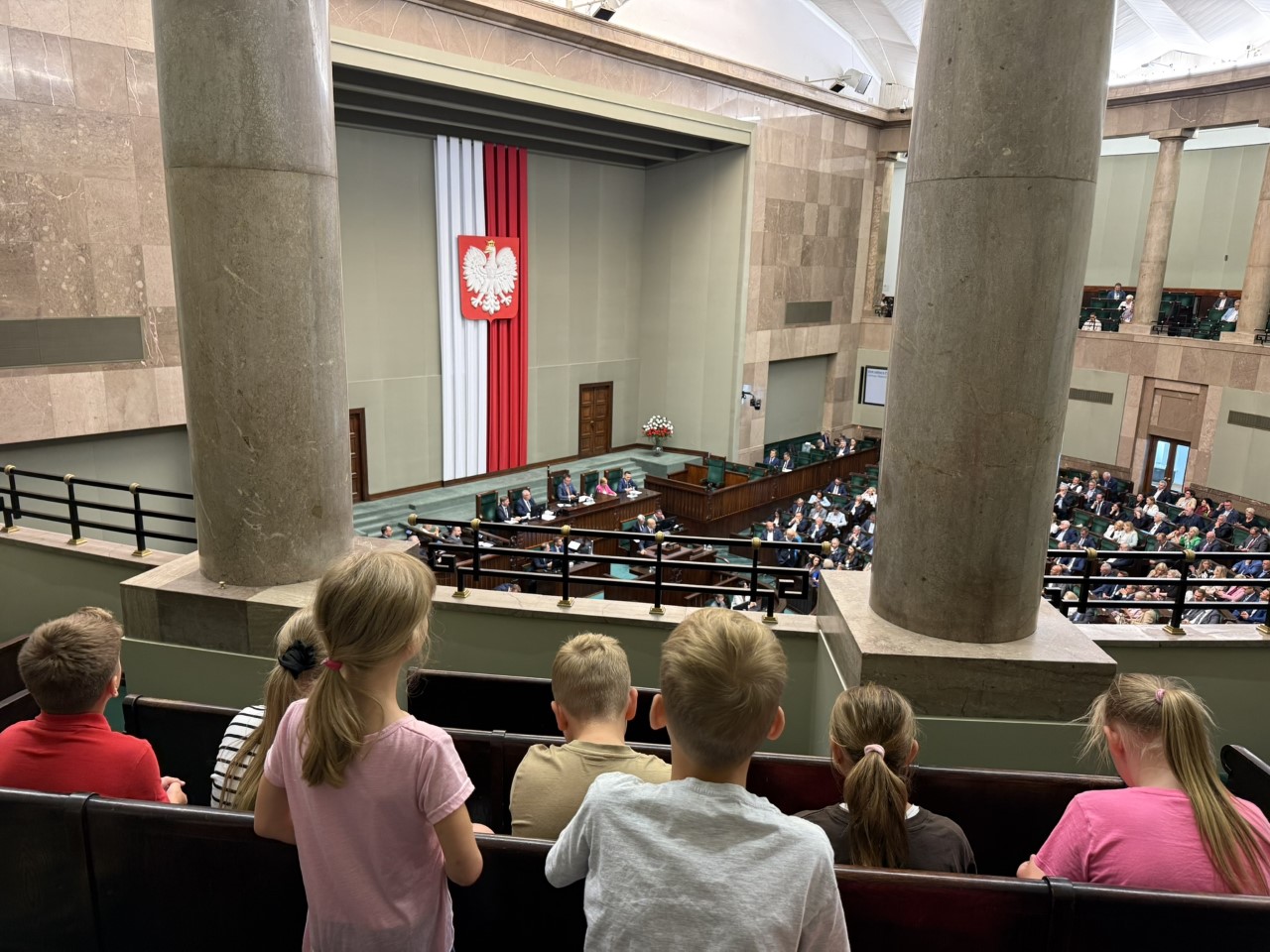 Następnie przeszliśmy do Sejmu, gdzie – ku naszej ogromnej radości – trafiliśmy na trwające obrady! Z galerii mogliśmy na żywo obserwować przemówienia znanych osób. Było to niesamowite doświadczenie – zobaczyć z bliska, jak wyglądają obrady i poczuć atmosferę tego ważnego miejsca. Byliśmy pod dużym wrażeniem – niektórym udało się rozpoznać posłów i posłanki, których możemy widywać w telewizji.
