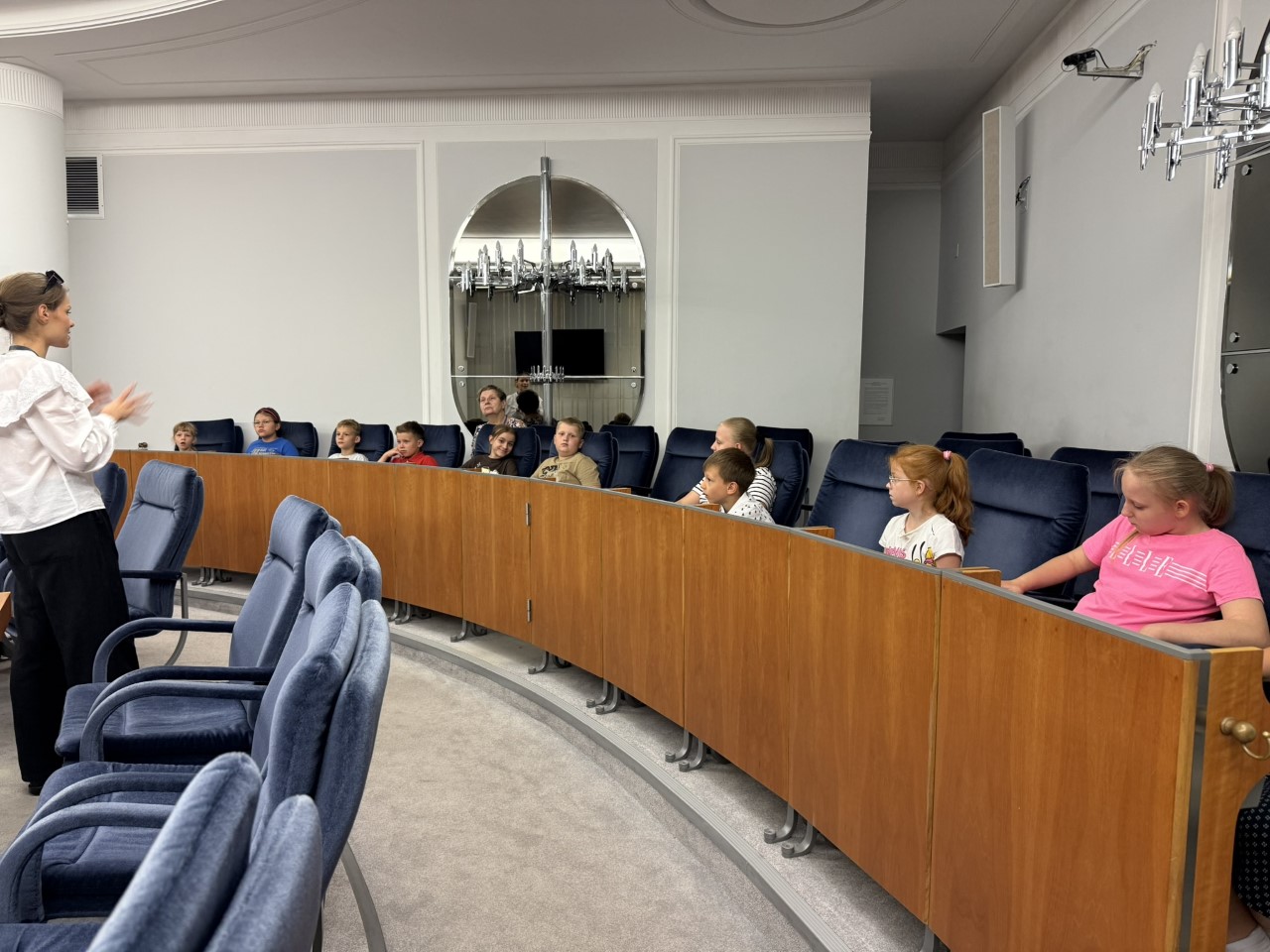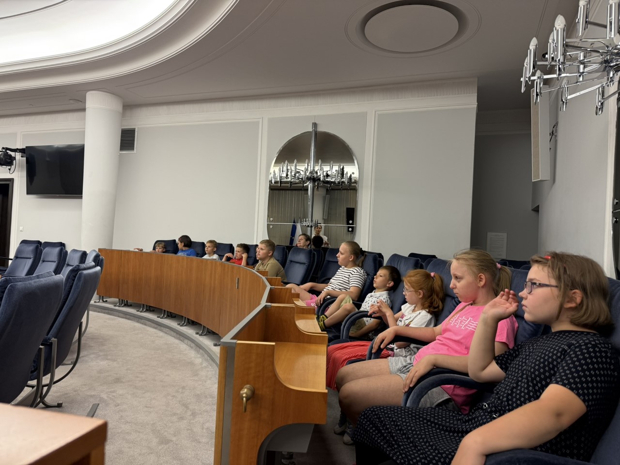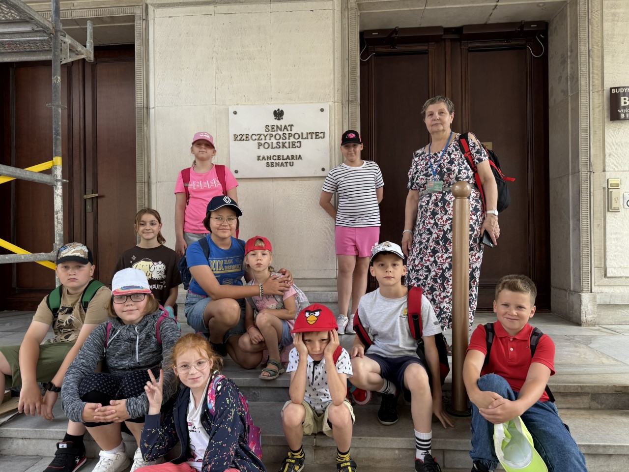 Rano udaliśmy się do budynków parlamentu. Zwiedzanie rozpoczęliśmy od Senatu, gdzie poznaliśmy historię tego miejsca i dowiedzieliśmy się, jak wygląda praca senatorów. Największą atrakcją było to, że mogliśmy usiąść na sali obrad, dokładnie tam, gdzie na co dzień zasiadają prawdziwi senatorowie! Z zaciekawieniem słuchaliśmy jak wygląda proces stanowienia prawa i jakie są zadania izby wyższej parlamentu.